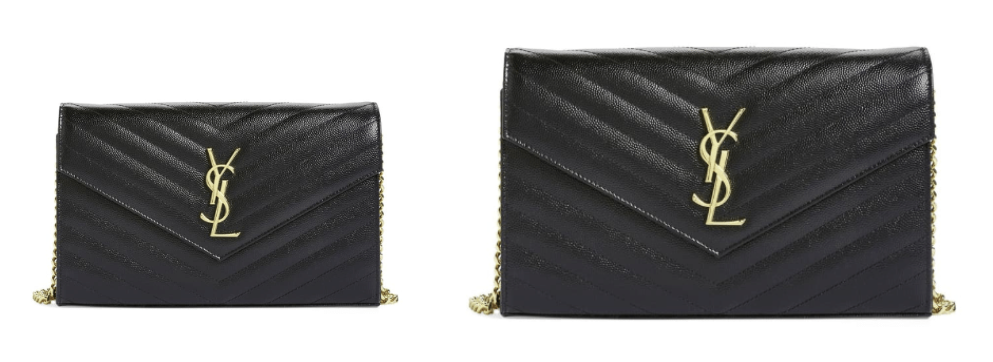 Saint Laurent นั้นมีกระเป๋าอยู่ที่ 2 ขนาด คือ 7 นิ้ว มีชื่อเรียกว่า Small และ 9 นิ้ว มีชื่อเรียกว่า Large โดยตัว 9 นิ้วนั้น คือ Classic Monogram Saint กระเป๋าเงินพร้อม สายสะพายโซ่โลหะ สามรถถอดออกได้ วัสดุเป็นหนังลูกทัวแท้ 100% สายสะพายไหล่ยาว 48 ซม. ภายในกระเป๋ามี 10 ช่องใส่การ์ด 1 ช่องเสียบเหรียญ 2 ช่องใส่บิล และ 2 ช่องใส่ใบเสร็จรับเงิน