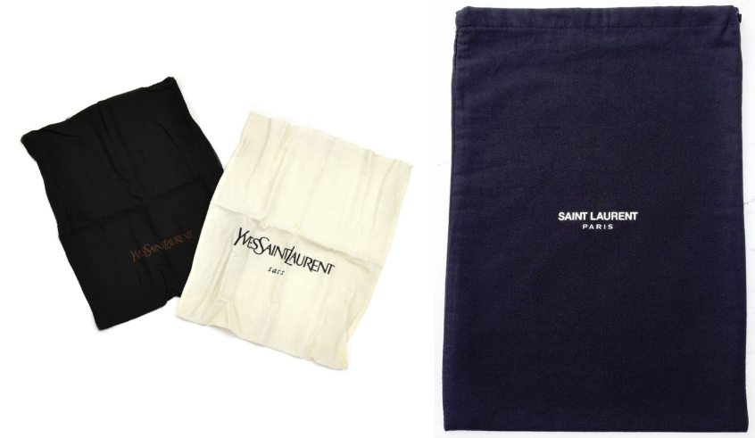 กระเป๋า Saint Laurent มักจะมาพร้อมถุง Saint Laurent ตามขนาดของกระเป๋า ถุงเก็บฝุ่นนี้มีมาตั้งแต่ดั้งเดิม สิ่งนี้จะช่วยปกป้องกระเป๋าของนักช้อปจากแสงแดดโดยตรง อีกทั้งยังสามารถป้องกันความชื้นได้อีกด้วย ส่วน โลโก้ Saint Laurent ที่สกรีนลงบนถุงผ้านั้น ทั่วไปใช้ชื่อ SAINT LAURENT PARIS ที่เป็นตัวอักษรสีขาวบนพื้นหลังสีดำ (ดังภาพฝั่งขวา) แต่ประมาณช่วงปี 2017 ได้มีการปรับเปลี่ยนการสกรีนให้เหลือแต่คำว่า SAINT LAURENT เท่านั้น