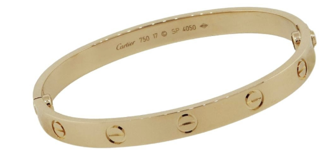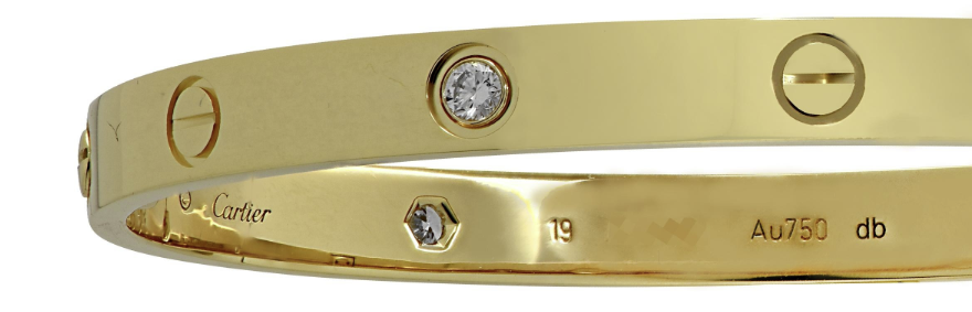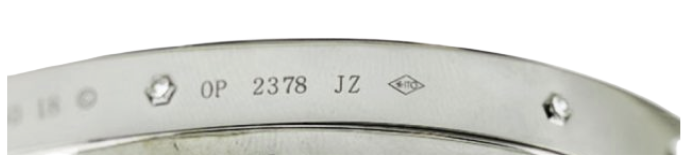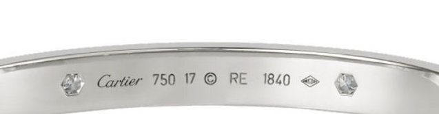 จุดแรก ที่สามารถสังเกตได้ด้วยตาเปล่า คือ การสลักลงในเครื่องประดับ จะสลักโลโก้ Cartier และตัวเลข 750 ลงฝั่งด้านในของกำไล การสลักของแบรนด์ตัวอักษรจะต้องเนี๊ยบละเอียด คมชัด ไม่มีรอยขรุขระ หรือ อักขระไม่ขาดหาย สามารถเห็นได้ชัดด้วยตาเปล่า โดยไม่ต้องใช้แว่นขยาย