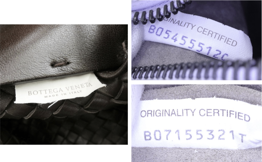 Date Code ใน 1 แผ่นจะมี 2 ฝั่งให้สังเกต คือ ป้ายฝั่งแรกจะเห็นเป็นสกรีนชื่อแบรนด์ BOTTEGA VENETA ตัวพิมพ์ใหญ่ ที่แถวบน และ MADE IN ITALY ตัวพิมพ์ใหญ่เช่นกัน แต่ขนาดเล็กกว่าที่แถวด้านล่าง เป็นตัวอักษรสีดำ ขนาดเท่ากันทุกตัว เมื่อพลิกมาอีกฝั่งจะเจอกับ คำว่า ORIGINALITY CERTIFIED (ด้านบน) และโค้ด (ด้านล่าง) ดังภาพ ซึ่งโค้ดจะต้องมีเพียง 10 ตัวเท่านั้น