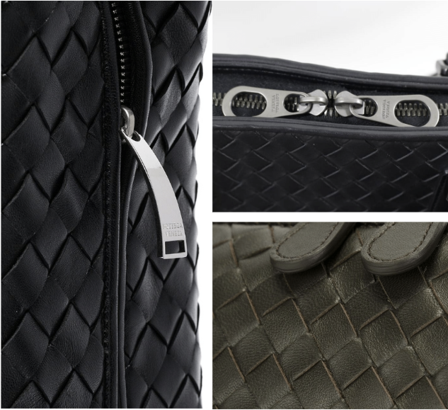 ในส่วนของ Hardware ของ Bottega Veneta นั้น ต้องสังเกตที่ซิป ถ้าหากเป็นซิปที่เป็นโลหะ จะต้องมีการสลักชื่อแบรนด์ BOTTEGA VENETA ตัวพิมพ์ใหญ่ ไว้ที่ซิปด้วย แต่ถ้าหากเป็นหนัง ตรงที่ซิปจะเป็นหนังชิ้นเล็ก ซึ่งสีจะต้องเข้ากับสีกระเป๋า ไม่อ่อนเกินไป ไม่เข้มเกินไปเด็ดขาด เพราะหนังที่นำมาทำนั้นเป็นหนัง ชนิด และประเภทเดียวกันกับหนังที่ใช้สานกระเป๋า อุปกรณ์อื่นๆ ของ Bottega Veneta จะค่อนข้างมีน้ำหนัก ไม่ลอก เนื่องจากทางแบรนด์ใช้วัสดุที่มีคุณภาพ