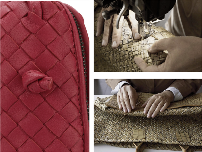 Material อย่างที่ทราบกันว่า Bottega Veneta นั้นกระเป๋าแบรนด์ผลิตมาจากหนังทั้งหมด โดยส่วนใหญ่แล้วผลิตจากหนัง Calfskin (หนังลูกวัว) , Lambskin (หนังแกะ) , Goatskin (หนังแพะ) และ Python & Snake Leather (หนังงูและงูเหลือม) โดยเอกลักษณ์ของแบรนด์ คือ การสานหนัง โดยที่นำหนังที่ผ่านกรรมวิธีต่างๆ แล้วมาตัดเป็นเส้น เพื่อถักสานจนกลายเป็นหนังผืนใหม่