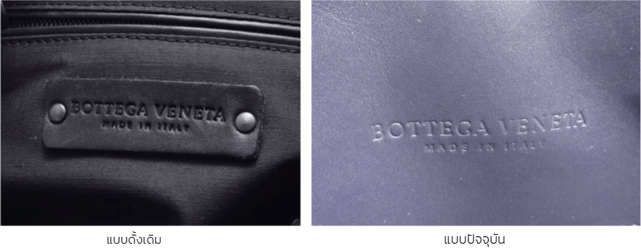 ภายในประเป๋า จะมีคำว่า BOTTEGA VENETA ตัวพิมพ์ใหญ่ ด้านบน และมีคำว่า MADE IN ITALY ตัวพิมพ์ใหญ่ ขนาดเล็กกว่า แต่บางรุ่นจะสลักลงบนแผ่นหนังเล็ก แล้วค่อนนำไปประกอบไว้ด้านในกระเป๋า บางรุ่นก็จะสลักที่กระเป๋าเลย ยกตัวอย่างเช่น รูปฝั่งขวา การแสตมป์จะอยู่บนแผ่นหนังเลย เนื่องจากการออกแบบ และพัฒนากระเป๋าของ Bottega Veneta เป็นไปตามยุคตามสมัย