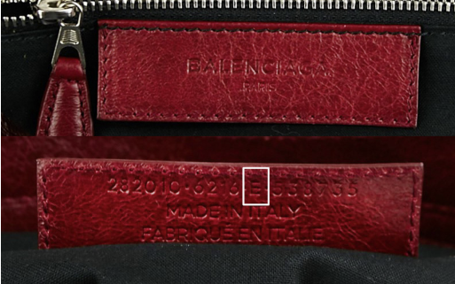 จะเห็นได้ว่ากระเป๋า Balenciaga ใบนี้ถูกผลิตขึ้นมาในปี ค.ศ. 2015 ใน Season S/S (Spring/Summer) จะเห็นได้ว่า ตรงสี่เหลี่ยมสีขาว (จากภาพตัวอย่างด้านบน) เป็นจุดตัวอักษรภาษาอังกฤษที่บ่งบอกถึงปี ค.ศ. ที่ได้ทำการผลิตกระเป๋าใบนี้ขึ้นมา แล้วตัวอักษที่ปั๊มประทับลงไปนั้น จะเป็นอักษรตัวใหญ่ มีขนาดเท่ากันทุกตัว จะไม่มีตัวเล็กปะปน หรือสะกดชื่อผิด และตัวเลขที่ปั๊มประทับจะต้องไม่มีลักษณะที่ขาดหาย หรือมองไม่เห็น การปั๊มประทับต้องชัดเจนมองเห็นได้ด้วยตาเปล่า
